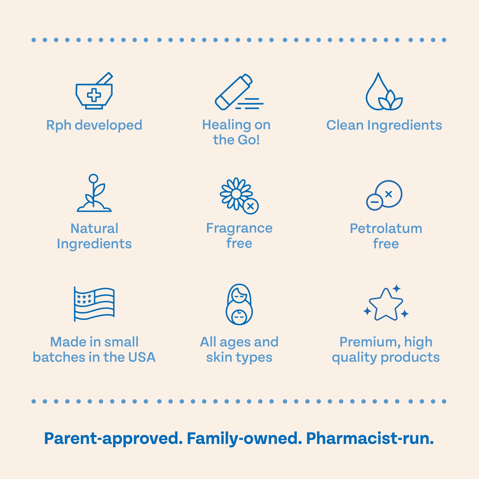 Discover soothing relief wherever you go with our Healing Stick. Developed by a pharmacist and father of three, this versatile stick offers instant comfort for a variety of skin irritations. From drool rash in infants to chapped nipples in nursing mothers, and raw nostrils from CPAP use in adults, its unique blend of moisturizing butters and oils provides gentle care without petrolatum or lanolin. Fragrance-free and made with clean ingredients for sensitive skin, it's perfect for your purse, diaper bag, gym bag, or medicine cabinet. Soften calluses, scars, heels, and elbows with repeated use, enjoying mess-free application and effective relief with every use.